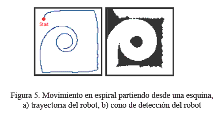 Existe un problema en particular en este caso, y es que si el mapa es desconocido, el punto inicial es desconocido para el robot, por lo que podría empezar en una esquina. En caso de que la espiral comience en una esquina y la dirección del robot tiende a chocar con la pared, el efecto causado será bordear toda la pared (un seguidor de paredes). Esto puede ser un problema, por lo cual se presenta una solución que es la de cambiar la dirección de la espiral y decreciendo después de un cierto tiempo, con esta solución el mapa volverá a ser explorado con una tendencia de llegar al punto central como se puede ver en la Figura 5. En el caso que este cerca de un objeto o de una pared, se utilizará el mismo evasor de obstáculos y evasor de paredes usados en los otros métodos para que el robot no tenga colisiones.