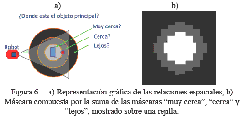 Las máscaras de coocurrencias de objetos se utilizan para representar la relación espacial en forma de anillos, con esto se puede obtener un radio de distancias representando a las variables lingüísticas: "Muy Cerca", "Cerca", "Lejos" y "Muy Lejos". Para obtener las máscaras y la matriz de coocurrencia, se usa el método descrito en (Loncomilla P., Ruiz del Solar J. y Saavedra M., 2013), donde ellos obtienen las máscaras considerando estadísticas de distancia entre objetos. Un ejemplo de máscara compuesta se muestra a lo largo de una rejilla con un tamaño de píxel de 0,1 [m] en la Figura 6.