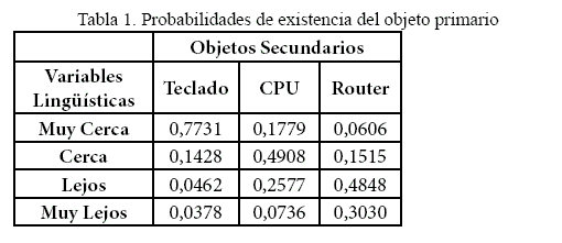 Como se puede ver en la Tabla 1, el valor para la variable "Muy Cerca" del objeto "Teclado" es de 0.7731, por lo tanto existe 77.30% de probabilidad que un "Monitor" este cerca al objeto "Teclado".