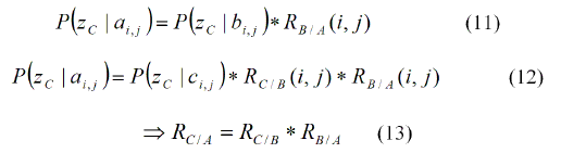 El término p(buv|a0) es considerada una constante en (u,v) cuya suma tiene un valor igual a uno, porque B supone que está en el mapa. El término p(buv|aij) corresponde a la relación espacial entre el objeto principal A en la posición (i,j) y un objeto secundario B en la posición (u,v). Mediante la sustitución de este término con la relación espacial RB|A, no hay necesidad de almacenar un mapa para el objeto secundario; sólo el mapa para el objeto principal y las verosimilitudes de las detecciones del objeto secundario son necesarios: