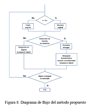 En el algoritmo mostrado anteriormente, t es el tiempo de cada acción del robot y lim es un límite de tiempo que define cuando crece la búsqueda en espiral y cuando decrece. Si existe una detección de objetos secundarios, el método usara la búsqueda probabilística. En caso contrario volverá a la búsqueda mediante la espiral.