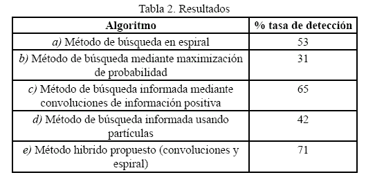 A partir de los resultados de los experimentos, se puede notar que el método de búsqueda mediante maximización de probabilidad (b) junto con el método descrito en (Aydemir et al, 2010) que usa partículas (d) tiene un desempeño bajo en las pruebas realizadas. El algoritmo de búsqueda en espiral (c) para ser un método no informado tiene un alto desempeño en la búsqueda de objetos, vale mencionar que la búsqueda en espiral es muy eficiente en ambientes sin paredes, ya que en un ambiente con paredes este tipo de búsqueda puede ser más lento. Los algoritmos que utilizan convoluciones ("c"y "e") para integrar la información acerca de los objetos secundarios en la distribución de probabilidad del objeto principal tienen el mejor rendimiento. El método hibrido propuesto (e) en este trabajo, es el de mayor rendimiento, ya que aumenta la tasa de detección hasta un 71%.