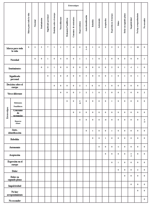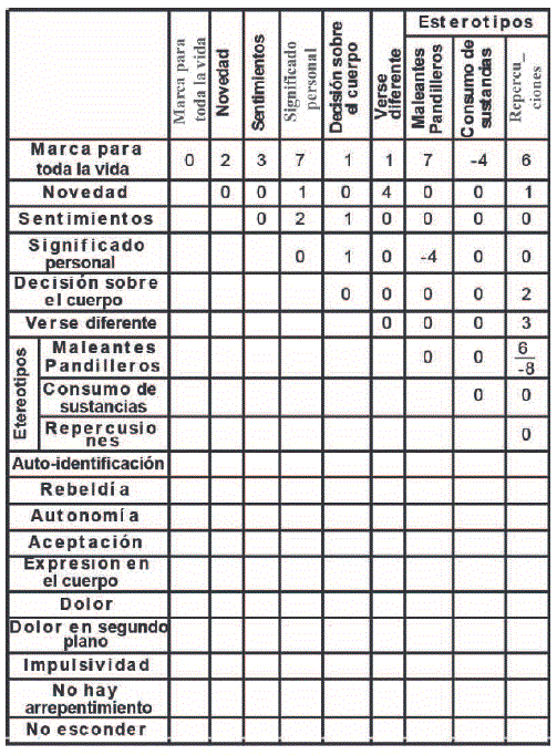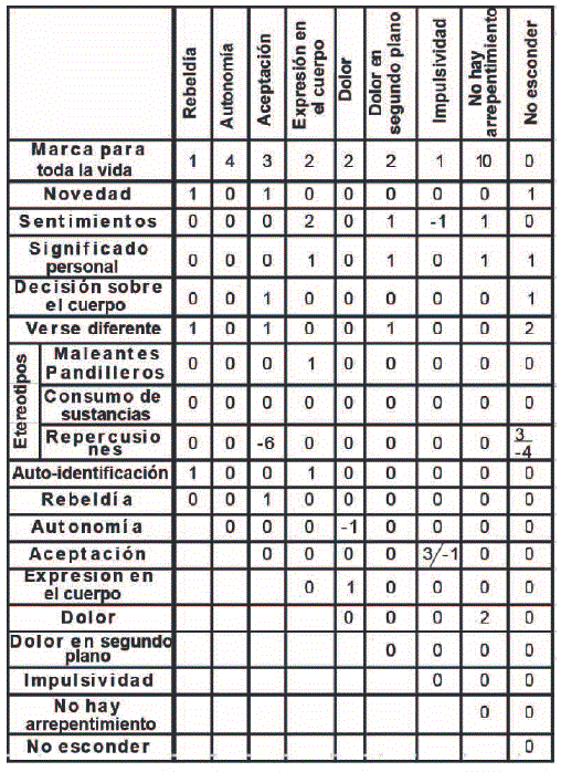 Pasando al segundo punto, la construcción de la RS del tatuaje en adolescentes del segundo grupo (adultos tatuados en el mismo rango de edad que la de los adolescentes) se obtuvo los siguientes resultados.