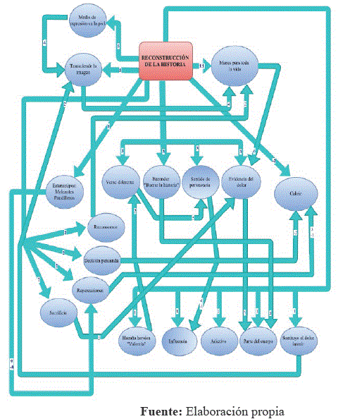 En cuanto al núcleo figurativo de la representación social formada por los adultos tatuados, este es: Reconstrucción de la historia. Esta reconstrucción histórica para los adultos va más allá, ósea que transciende la imagen al ser una marca con uno o varios significados expresados mediante la piel.