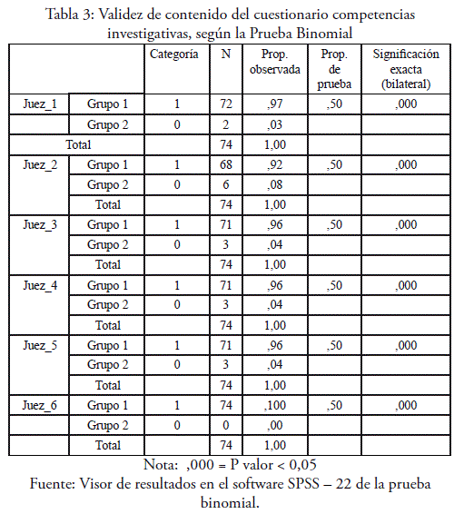 Para obtener la interpretación de resultados de la Prueba Binomial, se establece la Ho y la Ha, según Escurra (1988). Para el caso de la validez de contenido, las categorías son p (acuerdos) y q (desacuerdos) y se asume que p = q = 0,50. Se elige esta prueba porque los datos son dicotómicos y se tiene un solo grupo de sujetos. El cálculo realizado nos da la probabilidad de ocurrencia de modo directo, de manera que, si es menor de 0,05, se asume que el ítem posee validez de contenido.