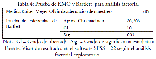 El análisis factorial Exploratorio (AFE), según el programa Spss y la tabla 4, nos da como resultado, mediante el coeficiente de Bartlett s (p = 0,003) menor al 0,05 y Kaiser-Meyer-Olkin (KMO) según los resultados obtiene (0,789 > 0,70) siendo significativo y a su vez siendo factible proceder con un análisis factorial.