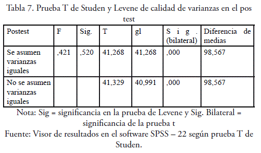 Otro de los supuestos en la lectura del p valor es la prueba de Levene sobre la igualdad de varianzas para decidir la T de Student a elegir entre ambas opciones, ya sea que se asuman varianzas iguales o diferentes para la decisión estadística. Sobre la calidad de varianzas y la prueba t de Student para la decisión estadística sobre la comparación de medias entre el grupo experimental y grupo de control, se detalla que el grado de significancia estadística en la prueba de Levene es de (sig. =.520), la cual cumple con la condición que el P valor es mayor al grado de significancia (0,520 > 0,05), por tanto, se asume que las varianzas son iguales y, por tanto, se toma la primera fila para elegir a la t de Student.