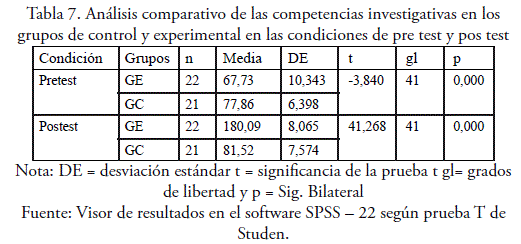 Como se evidencia en la tabla 7, los resultados de la prueba t de Student para muestras independientes nos permite afirmar que entre los grupos de estudio en la condición pretest existen mínimas diferencias (t=-3,840;gl = 41; p>0,05) siendo la media (GE = 67,73 y GC= 77,86); sin embargo, en la condición postest las diferencias son altamente significativas, observándose mayor capacidad en las competencias investigativas de comparación en estudiantes del grupo experimental (GE=180,09 y DE=8,065) en contraste con los del grupo control (GC=81,52 y DE=7,574). Ademas, el valor de la t de Student (t = 41,268) y el P - valor (sig. = ,000), siendo esta última menor al grado de significancia estadística (,000 < 0,05). Por tanto, en estas condiciones se rechaza la hipótesis nula y se acepta la hipótesis alterna: la aplicación del módulo autoinstructivo incrementará significativamente las competencias investigativas en los estudiantes del Programa de Complementación Pedagógica de una universidad privada.