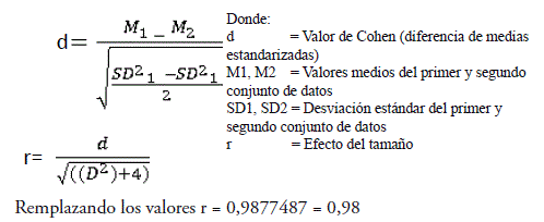 Hallar el tamaño del efecto es un complemento que nos ayuda a profundizar la diferencia de las medias en dos grupos independientes, es decir no basta con señalar que existe una diferencia significativa, sino cuán diferentes son o cuán importante es esta diferencia, a la cual se le conoce como tamaño del efecto (Cohen, 1988). En los análisis estadísticos, la prueba t de Student para comparar medias de grupos independientes utiliza la D de Cohen, el cual se representa bajo la siguiente fórmula: