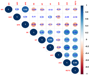 Las correlaciones fenotípicas entre las variables se calcularon utilizando el coeficiente de correlación de Pearson. Tales correlaciones constituyen en una medida de la magnitud de la asociación lineal entre 2 variables sin considerar causa y efecto entre ellas independientemente de las unidades. En la Figura 1, se presenta los valores de las correlaciones simples obtenidas entre pares de variables. Entre las variables de componentes de rendimiento, la correlación más alta correspondió al PF con el DP (r=0.80**), estas variables, en su orden, están altamente correlacionadas con el PF y DP (r=0.68** y r=053**). Las correlaciones positivas del NFI con el NRP (r=0.92**), y DE (r=-0.42**) indican que las plantas tienden a un mayor desarrollo de estas características causando frutos de menor diámetro.