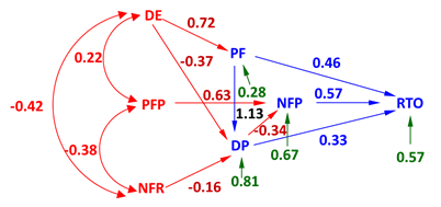 En la Figura 2 se presenta el diagrama de los coeficientes de sendero (CS) estimados de los efectos directos e indirectos de las variables evaluadas sobre el RTO en tomate, según el análisis de sendero. El principal efecto directo positivo fue ejercido por NFP (CS=0.57). Además, las otras variables que ejercieron un efecto directo positivo relevante fueron PF (CS=0.46) y DP (CS= 0.33), junto con una correlación altamente significativa con el rendimiento de fruto. Los principales efectos indirectos positivos sobre RTO fueron ejercidos por DE vía PF (CS=0.72) y PFP vía NFP (CS=0.63). Otros efectos indirectos positivos sobre RTO fueron ejercidos por DE a través NFP (SC=0.22). por otra parte, las siguientes variables ejercieron un efecto indirecto negativo sobre RTO: NFR vía DP (CS=-0.16) y DE a través de DP (CS=-0.37).