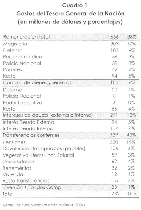 En el Cuadro 1 se observa la desagregación del gasto público según su destino. Si bien la asignación presentada es objeto de mucha polémica, llama la atención que más de un cuarto del presupuesto se asigne a Magisterio y Defensa, por lo cual surgen algunas preguntas de rigor: ¿están generando estos recursos el impacto deseado?, ¿cuán efectivo es el gasto público en general?, ¿cuál es el impacto de la política pública en términos de una mayor competitividad?.