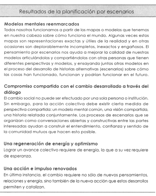 El proceso de planificación por escenarios produce cuatro resultados: a) modelos mentales reenmarcados; b) compromiso compartido con el cambio desarrollado a través del diálogo; c) una regeneración de energía y optimismo y d) acción e impulso renovados.
