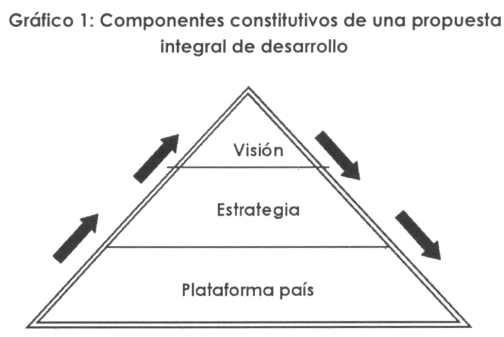 La consolidación de un ambiente propicio para que emerja el espíritu emprendedor corresponde justamente al tercer elemento constitutivo de nuestro esquema: la plataforma-país. De manera genérica, la plataforma-país comprende las condiciones meta, macro, meso y microeconómicas necesarias para que la estrategia pueda constituirse en un mecanismo efectivo para el logro de la visión. En la medida en que la plataforma no ayude a construir el entorno adecuado serán muy limitados o incluso nulos los resultados que la estrategia pueda producir.