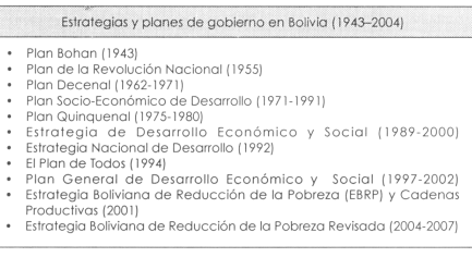 Especial atención merece el débil proceso de socialización bajo el cual se desarrollaron la mayoría de estas estrategias, por lo que, en el mejor de los casos, algunas se convirtieron en simples planes de gobierno y no asi en políticas de Estado. Se destaca la Estrategia Boliviana de Reducción de la Pobreza, realizada en el Diálogo 2000, como la más participativa, pero incluso así ésta ha perdido vigencia y legitimidad. En cuanto a su ejecución, entre los planes más efectivos se puede citar al Plan Bohan y al Plan de Todos, lo cual no necesariamente implica una mayor efectividad con respecto al logro de los resultados deseados en términos de desarrollo.