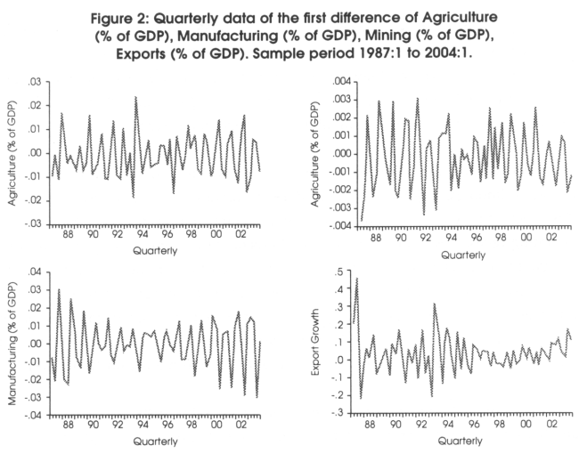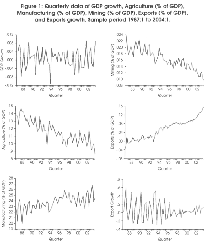 The data consists of a set of Turkish macroeconomic variables obtained from DATASTREAM database. The dataset includes GDP, agriculture, manufacturing, mining, and exports and are expressed in U.S. dollars. The data are quarterly, seasonally adjusted and cover the period 1987:1 to 2004:1. All data points are transformed into logarithmic scale and used to compute GDP growth, percentage share of agriculture in GDP, percentage share of manufacturing in GDP, percentage share of mining in GDP, percentage share of exports in GDP, and export growth.