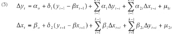 Here δ1 and δ2 denote speeds of adjustment of the variables yt and xt, respectively, to the long-run equilibrium, and μ1t and μ2t are serially uncorrelated errors. In this formulation, failing to reject H01: α21 = α22 = ... = α2k = 0and δ1= 0 implies that yt does not Granger cause xt, while failing to reject H02: β21 = β22= ... = β2k = 0 and δ2=0 indicates that xt does not Granger cause yt.