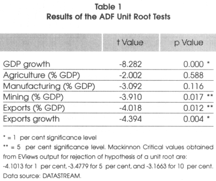 In Table 1, we show the Augmented Dickey and Fuller unit root test on GDP growth, percentage share of agriculture in GDP, percentage share of manufacturing in GDP, percentage share of mining in GDP, percentage share of exports in GDP, and exports growth. The unit root hypothesis is rejected at 1 per cent level for the GDP growth and Exports growth to confirm their stationarity. At the 5 per cent level, the unit root is rejected for the percentage share of mining and the percentage share of exports in GDP The remaining variables display the unit root property. These results suggest us to correct for such inconvenience by shifting the series to their first difference and hence lead to stationarity.