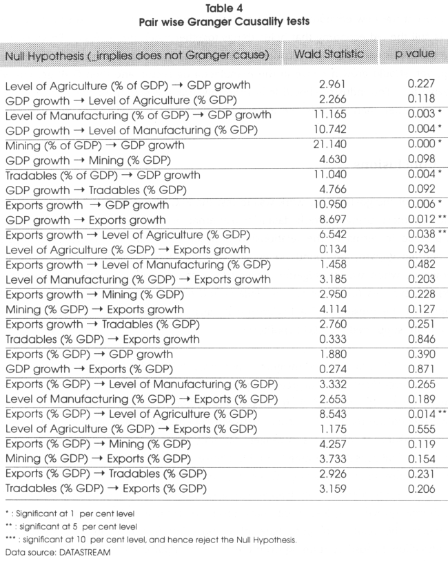 The results of the pairwise Granger causality test are shown in Table 4. These results stand on their own as empirical facts. We observe that there is evidence of bidirectional causality between GDP growth and manufacturing, and GDP growth and export revenues (in dollar terms). Additionally, the changes in export growth and export revenues lead that in agriculture. Moreover, there is a significant relationship between tradables in general, especially manufacturing and mining, and GDP growth. Thus, it a confirmation of our previous hypothesis that there is a positive relationship running from the relative share of manufacturing in output and the relative size of tradable sector to economic growth. In addition, the ELG hypothesis is supported with export revenues (in dollar terms) but not with export as share of GDP.