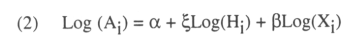 Where Yi is the output obtained from combining the physical capital (Ki) and labor (Li) in country i, and Ai is the total factor productivity (TFP) of that country. The TFP may be affected by several factors other them the stock of knowledge, Hi, which is our main focus here. We assume it to have the following form Ai=aHξiXβi. Thus, the overall effect can be written in the log form as