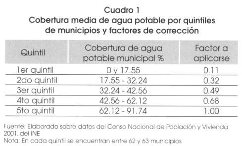 El ponderador de agua potable ha sido obtenido a partir de datos sobre cobertura correspondientes al año 2001. Mientras menor es la cobertura de servicios de agua potable, menor será el efecto del gasto territorial municipal. En el Cuadro 1 se muestra la cobertura media de agua potable por quintiles de municipios y el respectivo factor a aplicarse para estimar el gasto territorial municipal equivalente.