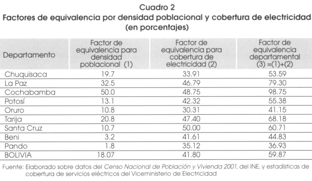 El ponderador de electricidad ha sido obtenido a partir de datos actualizados al año 2005 de la cobertura en el país. Mientras menor es la cobertura eléctrica, menor será el impacto del gasto ("gasto equivalente") de cada departamento.