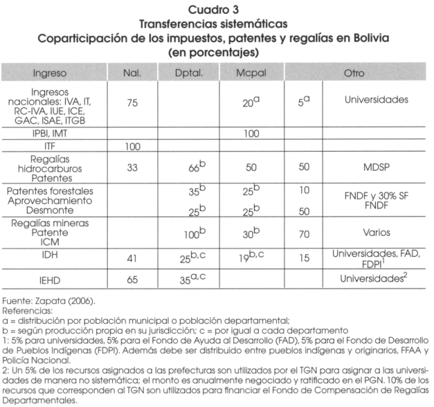 El cuadro 3 muestra los distintos tipos de impuestos existentes y los porcentajes de transferencia sistemática entre los distintos niveles de gobierno y otras instituciones subnacionales. El cuadro además muestra, como referencia, los criterios de coparticipación, algunos de los cuales siguen siendo población municipal o, en el caso de las universidades, población departamental. En otros casos se asigna una suma igual por prefectura (que ha resultado ser lo más perjudicial para la distribución equitativa de recursos). Finalmente, otro criterio de coparticipación es el producto interno bruto generado dentro de cada jurisdicción.