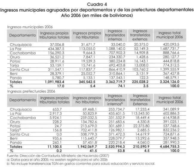 El Cuadro 4 muestra la composición de los ingresos municipales y prefecturales. Los municipios logran obtener como recursos propios tributarios el 17% de los ingresos totales y las prefecturas en este rubro sólo obtienen el 0.2% de los ingresos totales. Del cuadro llama la atención los ingresos propios no tributarios obtenidos por municipios y prefecturas; esto se debe a que se contabilizan en esa categoría los ingresos por regalías que en el caso de algunas prefecturas, tales como las de Tarija, Potosí y Santa Cruz, son porcentajes muy altos en relación a sus ingresos totales. No obstante, el principal ingreso subnacional son las transferencias internas recibidas, las cuales se constituyen en 74.1 % y 53.8% del ingreso municipal y prefectural, respectivamente. Debe tomarse en cuenta que las transferencias prefecturales no incluyen las del TGN por concepto de gasto corriente social.