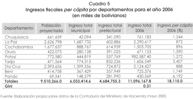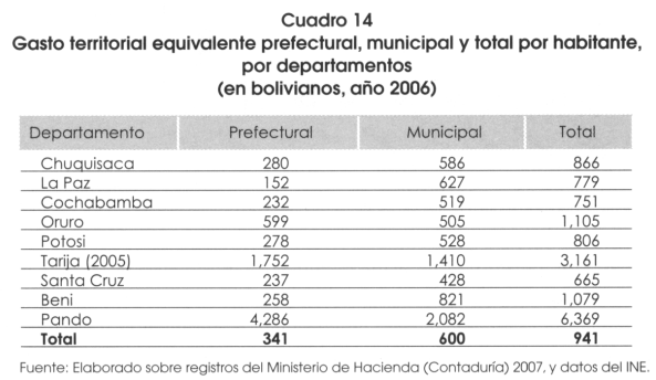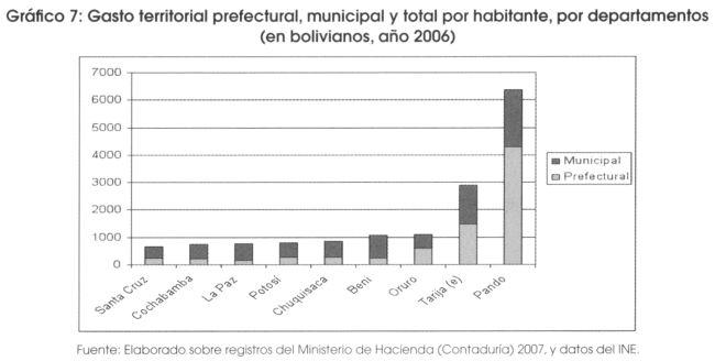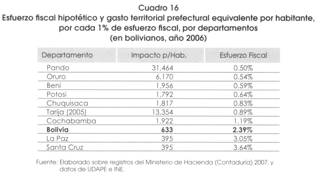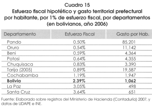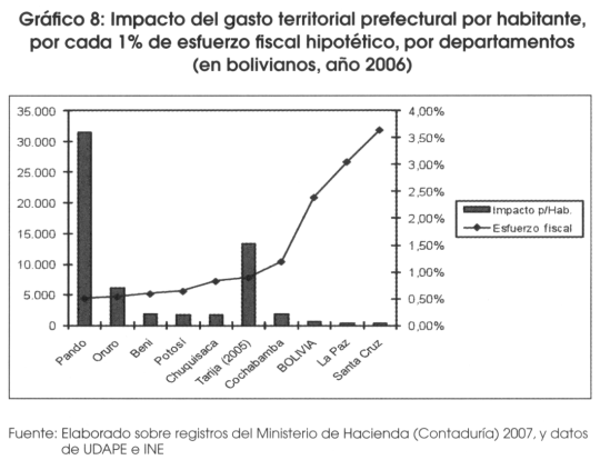 Sin embargo, si se calcula cuál sería el nivel de gasto territorial actual (2006) que los habitantes estarían percibiendo por cada 1 % de esfuerzo fiscal destinado a su prefectura, se encuentran grandes desigualdades: quienes estarían obteniendo menos por sus hipotéticos aportes a su entidad departamental serían los habitantes de La Paz, seguidos de los de Santa Cruz. Todos los demás se encontrarían por encima de la media nacional, pero los de Tarija la superarían en 19 veces ¡y los de Pando en 85!.