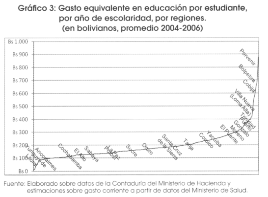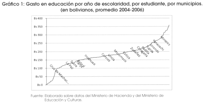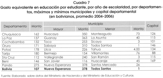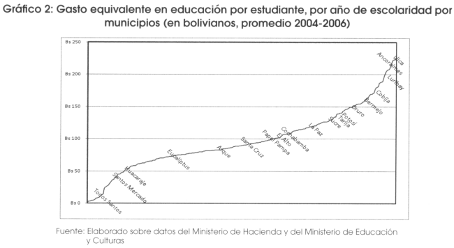 Normativamente, el gasto equivalente por estudiante y año de escolaridad y el que corresponda a cada usuario potencial de servicios de salud deberían ser iguales. Sin embargo, los promedios departamentales de gasto equivalente en educación varían desde Bs.77 anuales por estudiante y por año de escolaridad en Beni, hasta Bs. 145 en Pando. Para la ciudad de Santa Cruz de la Sierra, el indicador da Bs. 88, mientras para Cobija alcanza a Bs. 169 (casi el doble que en Santa Cruz). En la mayor parte de los municipios rurales el gasto equivalente por estudiante y año de escolaridad se ubica por debajo de los Bs. 80. La desigualdad entre los habitantes de cada municipio da lugar a un coeficiente Gini de 0.31.
