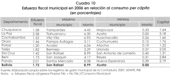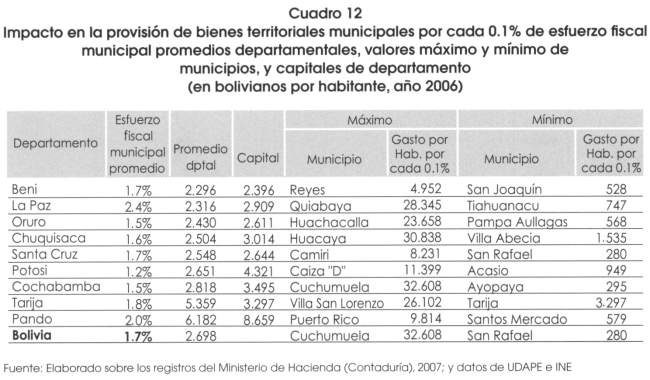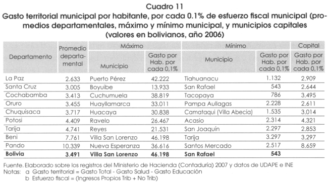 Como era de esperar, las diferencias entre municipios son muy grandes. El gasto territorial municipal más bajo por punto de esfuerzo fiscal municipal, Bs. 543 por habitante, corresponde a San Rafael (Santa Cruz), que también se caracteriza por un elevado esfuerzo fiscal. No muy lejos de este valor se encuentran los habitantes de Tacopaya (Cochabamba), con Bs. 786 Los demás mínimos superan los Bs. 1,000, correspondiendo el mínimo más alto (Bs. 3,297) a la ciudad de Tarija. En todo caso, en cada departamento las diferencias entre máximo y mínimo son muy amplias, correspondiendo las menores al departamento del Beni.