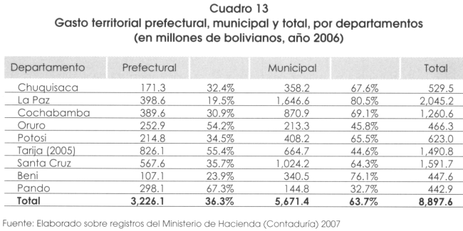 Según se puede apreciar en el Cuadro 13, las prefecturas departamentales deciden una parte muy importante del gasto territorial: el 36.3% del total. En algunos departamentos, como Pando, Oruro y Tarija, las prefecturas constituyen el componente más importante de este gasto, mientras en los demás, y sobre todo en La Paz, la mayor parte del gasto territorial corresponde a decisiones municipales.
