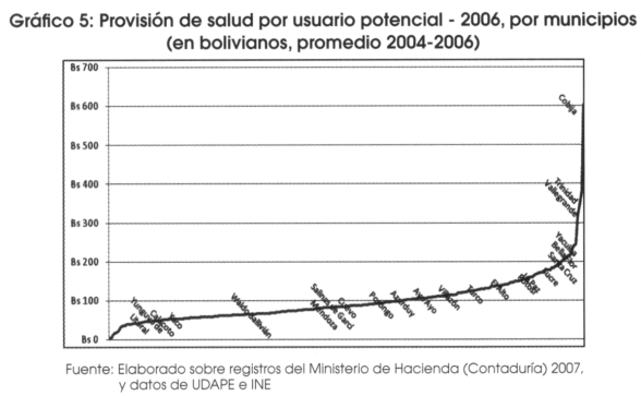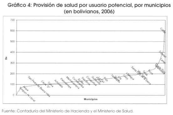 Entre todos los municipios se observa que Cobija es el que marca el máximo nacional y el gasto es 150 veces mayor al municipio de Yunguyo del Litoral, que es el que muestra menor gasto por usuario en salud, y 5 veces mayor al gasto del municipio de Cochabamba, que se constituye en el municipio capital con menor gasto en el sector. Comparando a todos los municipios, la inequidad en la provisión resulta levemente menor que en el caso del gasto: el índice Gini aumenta en 4 puntos y alcanza a 0.29 (siendo 0.26 en el caso del gasto).