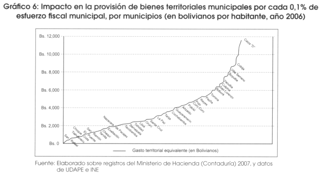 Los niveles de gasto territorial municipal por habitante (gasto decidido por los gobiernos municipales menos el destinado a educación y salud) están muy lejos de corresponder al respectivo esfuerzo fiscal. Por cada 0.1 % de su ingreso que un habitante del departamento de La Paz destine a su municipio, percibirá cada año, en promedio, Bs. 2,633 de gasto en bienes territoriales, y uno del departamento de Santa Cruz, Bs. 3,005. En cambio, por el mismo esfuerzo (respecto a su nivel de consumo), uno de Potosí se beneficiará con Bs. 4,409, uno del Beni con Bs. 4,741 y uno de Pando con Bs. 10,339. Entre ciudades capitales las disparidades son parecidas: en promedio, por cada 0.1 % de su consumo que un habitante de Oruro paga a su municipio percibe un gasto en bienes territoriales de Bs. 2,611; uno de Santa Cruz de la Sierra, Bs.2,644, y uno de La Paz, Bs.2,909. En cambio, por un mismo nivel de esfuerzo fiscal, los habitantes de la ciudad de Potosí perciben Bs. 4,321 y los de Cobija, Bs. 8,659.