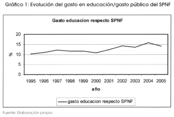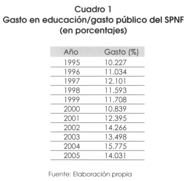 Los sistemas educativos en los países en desarrollo han registrado un extraordinario crecimiento en las últimas dos décadas. Bolivia no fue la excepción, pues el gasto en educación se incrementó de manera sustancial en una década. Entre 1995 y 2005, el gasto en educación -excluyendo al sistema universitario- como porcentaje del total del gasto público (gasto del sector público no financiero) aumentó en 37.3 %, como se puede ver en el Cuadro 1 y la Figura 1, lo que denota una clara línea de orientación hacia el gasto social como parte de la política educativa nacional a partir de la aprobación de la Reforma Educativa en 1994 (Ley 1 565). En 1995 el gasto en educación dentro del gasto del sector público representaba el 10.22 %, y en el 2005 lo era del 14.03 %, registrando un pico en el 2004, con 15.77%.
