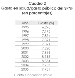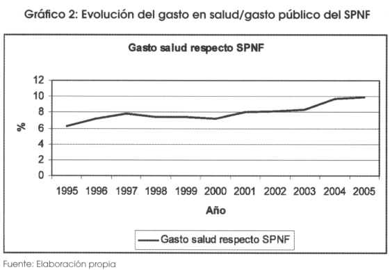 El comportamiento del gasto en salud respecto al gasto del sector público no financiero no fue menos destacable. En el mismo período de 1995 a 2005, el gasto en salud respecto al gasto público creció en 58.17 % , de un nivel de 6.28 % en 1995 a 9.93 % en 2005, tal como se aprecia en el cuadro 2 y en la figura 2 siguientes:
