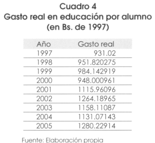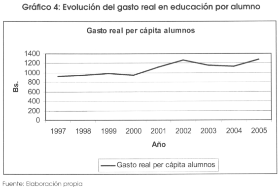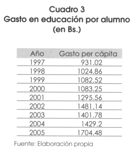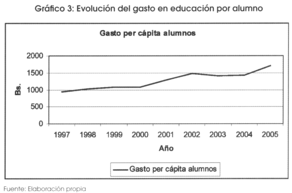 Un indicador que permite evaluar con mayor precisión el comportamiento del gasto en educación es el gasto por alumno o gasto per cápita. En el Cuadro 3 se observa que el gasto en educación por alumno creció de manera sostenida entre 1997 y 2005, registrando un notable crecimiento de 83 % en ese período. El gasto per cápita en educación en 1997 era de Bs. 931, y en 2005 se incrementó a Bs. 1,704 por alumno, lo que representa una tasa anual de crecimiento promedio de 7.84 %.