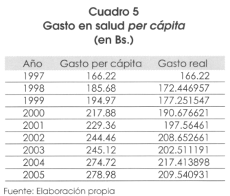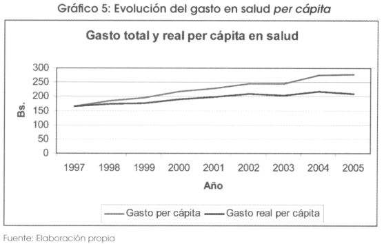 En términos reales, el crecimiento acumulado entre 1997 y 2005 del gasto en salud per cápita fue de 26.06% y registró una tasa promedio anual del 2.93%.