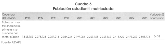 Sin embargo, una medición más precisa del gasto en educación per cápita se consigue mediante términos reales, es decir, descontando el efecto de la inflación. Considerando el año 1997 como el año base (1997 = 100), el gasto en educación por alumno para el mismo período 1997-2005 registra un crecimiento acumulado de 37.5% y una tasa promedio anual del 4.06%, superior al crecimiento de la economía nacional para el mismo período (2.87%).