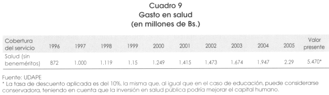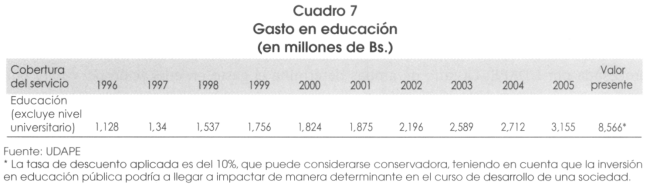 Si se asume una tasa de descuento más alta para la inversión en educación, por ejemplo del 15%, la ratio RCEE aumentaría a 6.2. En cualquier caso, se advierte que una RCEE positiva confirma la tendencia de la importancia creciente del gasto de la educación en Bolivia en la economía, lo cual es una buena noticia. Esto demuestra que, más allá de las diferencias de orientación política de los diferentes gobiernos en la década 1996-2005, la educación ha merecido una atención relativa mayor por parte del Estado, que genera las condiciones para asentar y consolidar en el futuro una política de Estado de largo plazo.