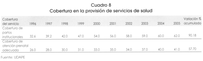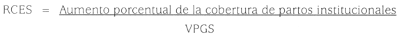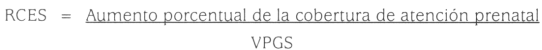 El sector salud enfrenta las mismas limitaciones de información que el sector educación, y por la misma razón, un buen indicador alternativo de efectividad sería la cobertura de atención prenatal adecuada o la cobertura de partos institucionales. En consecuencia, la relación costo-efectividad se medirá a través de la siguiente ratio: