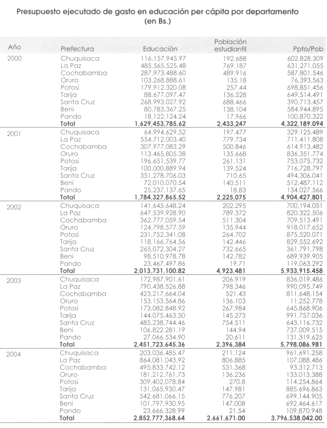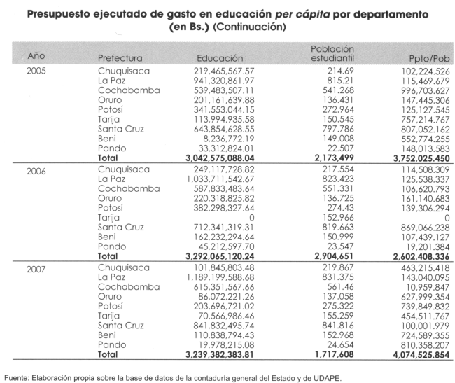 En el Anexo 1 se presentan estadísticas del presupuesto ejecutado del gasto en educación a nivel departamental elaborado por la contaduría del Estado, y población estudiantil procesada por UDAPE. La ratio de ambas determina el gasto en educación per cápita por departamento. Se debe alertar que la información de la contaduría no es información que se publica y tiene limitaciones, como por ejemplo la ausencia de información para el año 2006 para el departamento de Tarija.