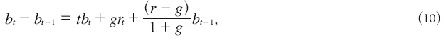 Operando con las ecuaciones 8 y 9 se deriva la ecuación de acumulación de activos externos netos como coeficiente del PIB, la cual denotamos para todas las variables con letras minúsculas: