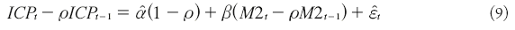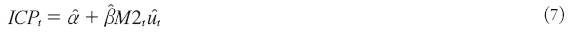 It is important to note that despite the fact that in the following equations the variables ICP and M2 are used for illustrative ends, the natural log form for CPI and M2 is being used. in other words, in the following equations log(ICP)=ICP and log(M2)=M2.