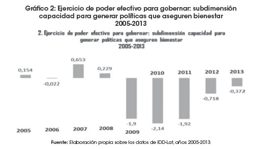 IDD-Lat es un índice creado el año 2002 por el Konrad Adenauer Stiftung, que busca medir el desarrollo democrático de los países latinoamericanos. Dicho instituto analiza aspectos democráticos de 18 países de la región, los cuales son evaluados y comparados numéricamente sobre la base de cuatro dimensiones distintas. La primera se define como legalidad o institucionalidad del régimen democrático, y se puede considerar como una verdadera barrera de entrada paralos países que se desea evaluar. No constituye una dimensión numérica, pero si es el umbral mínimo para comenzar el estudio. Como segundo indicador se presenta el respeto de los derechos políticos y libertades civiles; como tercer indicador se encuentra la calidad institucionaly eficiencia política, para terminar con una cuarta dimensión, que considera el ejercicio del poder efectivo para gobernar. Esta última tiene dos subíndices bien definidos: capacidad para generar políticas que aseguren bienestar y capacidad para generar políticas que aseguren eficiencia económica. Precisamente son estos dos subíndices los que cuantificaremos para analizar el desempeño de la democracia en esos aspectos en Bolivia, bajo el gobierno del presidente Morales.