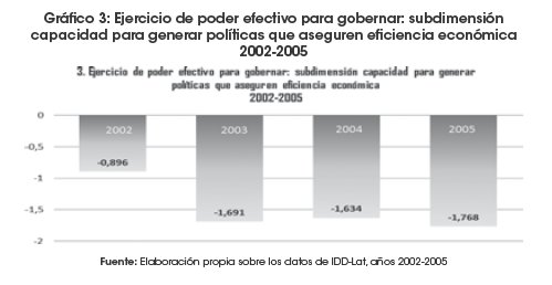El Gráfico 3 da cuenta de cómo ha sido la tendencia en Bolivia en cuanto al desarrollo de politicas públicas que a su vez demuestren manejo económico. Los datos son claramente negativos y muestran cómo la democracia no fue capaz de responder a estas situaciones.