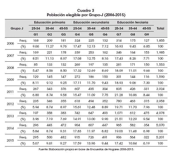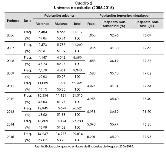 Adicionalmente, con el objetivo de contar con resultados en términos de indicadores de bienestar interpretables, se omitió a las mujeres trabajadoras del hogar cama adentro y a sus parientes. Este procedimiento se realizó para evitar que la situación laboral e ingresos simulados para esta población afecten el nivel de ingresos del hogar al que éstas no pertenecen9. En base a estas consideraciones, en el cuadro 2 se presenta el tamaño del universo de estudio y la muestra de miembros elegibles para la simulación de 2006 a 2015.