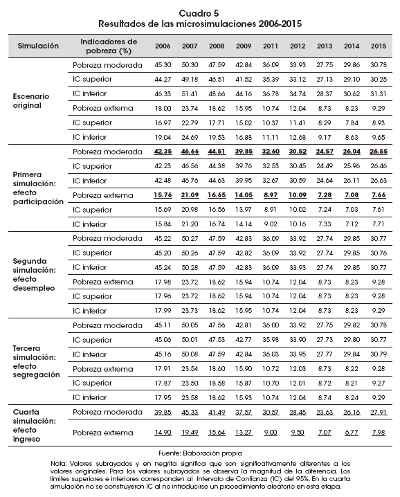 Este proceso consiste en la generación y asignación de números aleatorios a los individuos agrupados en j grupos de acuerdo a sus características sociales, y en k segmentos laborales. Esta estrategia permite determinar, una vez introducidos los indicadores contrafactuales: i) quiénes pasan de la inactividad a la actividad o viceversa, ii) quiénes obtienen un trabajo o pasan a ser desempleados, iii) quiénes pasan de un sector a otro, y iv) cómo son asignados los nuevos ingresos laborales medios a nivel individual5. Debido a la introducción de un proceso de asignación al azar, se realizaron 30 iteraciones por microsimulación6, lo que permitió la construcción de intervalos de confianza del 95% para los índices de pobreza moderada y extrema, excepto en el caso de la simulación del nivel de remuneración, en la cual no se involucraron números aleatorios.