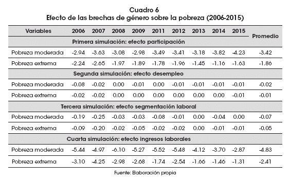 De forma similar al indicador de pobreza anterior, se observa en el cuadro 6 que, en general, los mayores efectos sobre la pobreza extrema provienen de los efectos ingreso y participación laboral. No obstante, en ambas simulaciones los resultados obtenidos fueron significativamente menores a los que se observan en el indicador de pobreza moderada. Como se evidencia, la igualación en las distribuciones de ingresos laborales habría significado en promedio para el periodo de estudio, la disminución de este indicador en 2.41p.p., mientras que el incremento de la participación laboral de la población elegible en la simulación habría significado la disminución de la pobreza extrema en 1.86 p.p.
