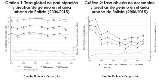 Los indicadores laborales del área urbana de Bolivia presentan resultados desiguales en desmedro de la población femenina. Como se observa en el gráfico 1, la proporción de la población masculina económicamente activa se encontró de 2006 a 2015 por encima de la población femenina, con una brecha promedio medida a partir de la diferencia masculino-femenina de la Tasa Global de Participación (TGP) de 17.78 puntos, y una mediana de 17.56 puntos (cuadro 1). La desigualdad en esta esfera no sólo fue alta, sino también creciente. Esto principalmente debido a la paulatina disminución de la TGP femenina, que se refleja en la tendencia del ratio de participación ilustrada en la parte inferior del gráfico.